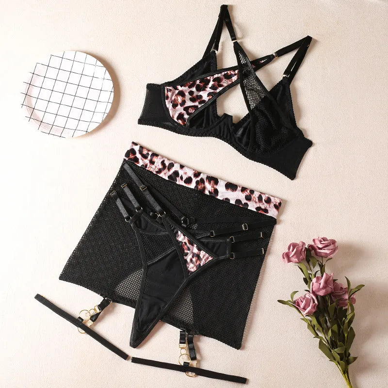 Conjunto de lencería de rejilla con motivo de leopardo