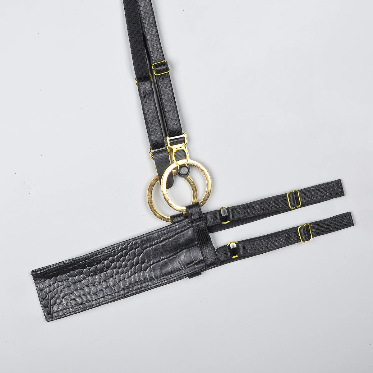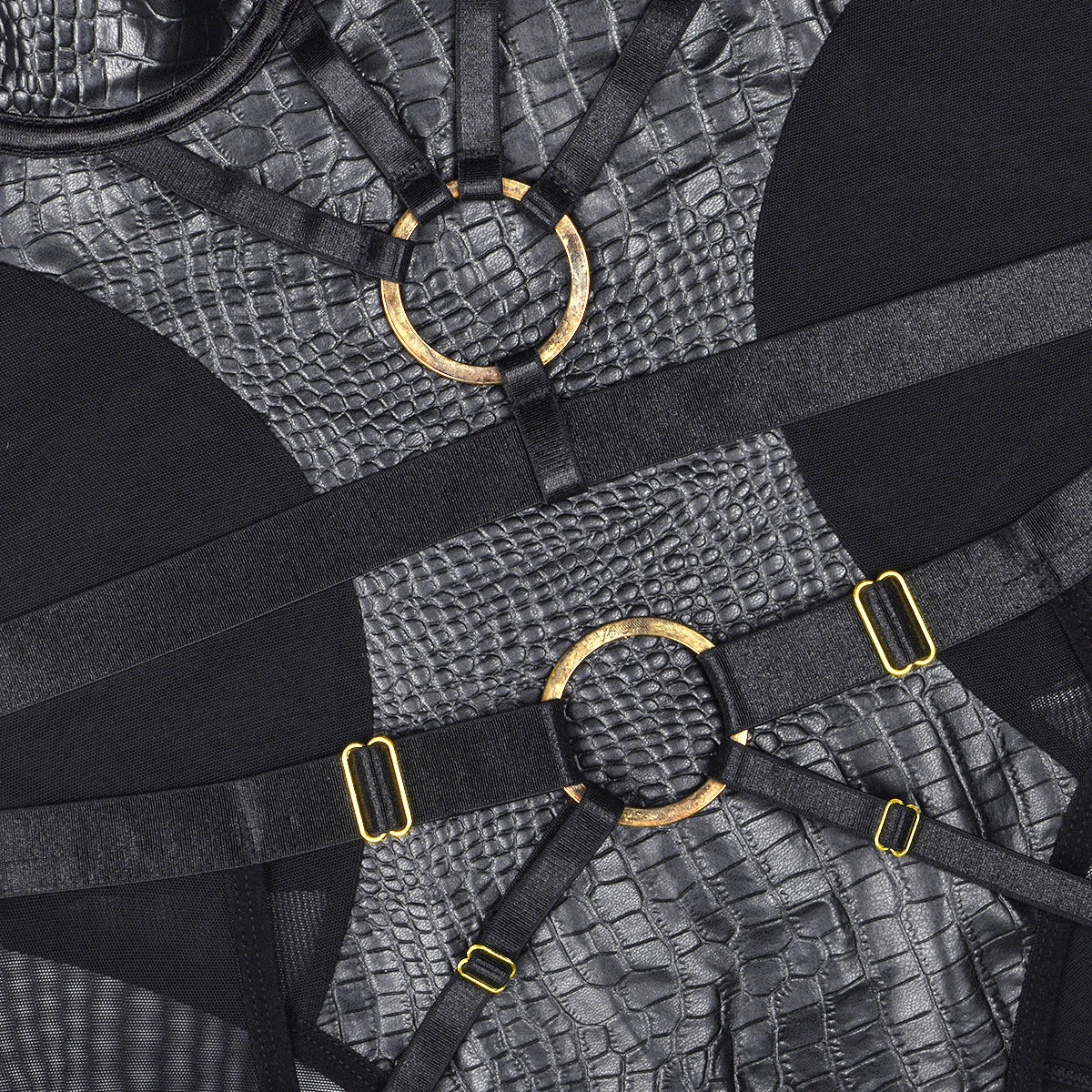 Body de cuero sintético con ribete de malla y anillos metálicos
