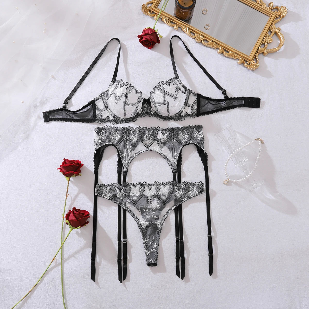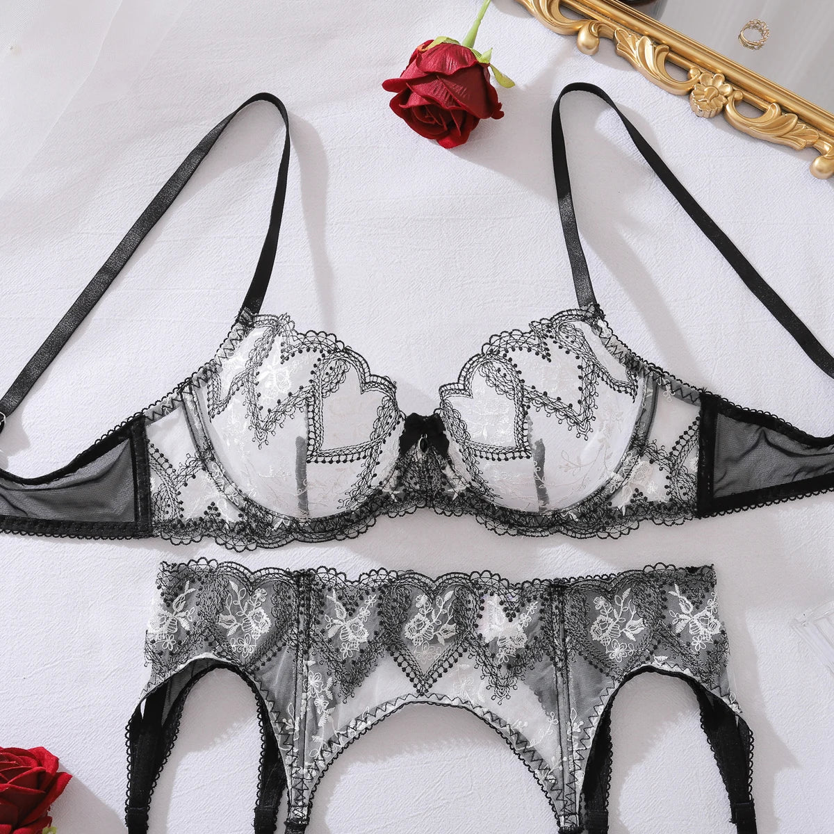 - Conjunto de ropa interior: sujetador, braguita y liguero - Lencería de malla - Ribete de - 2 variantes disponibles