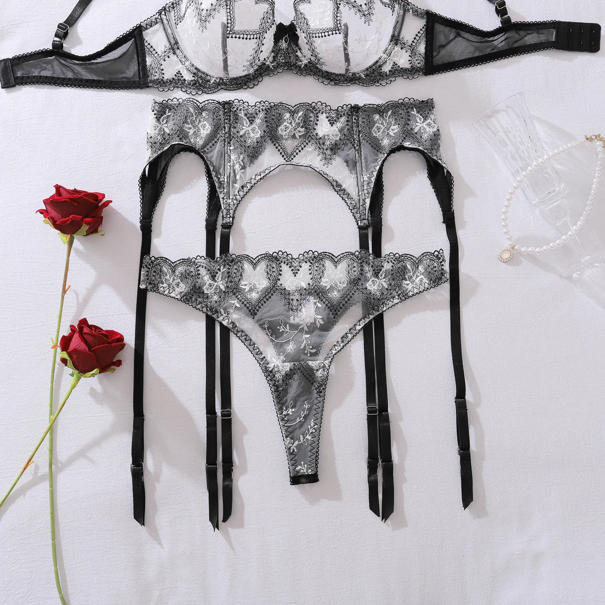 Conjunto de lencería de encaje con liguero ancho y bordado - Laurene.es
