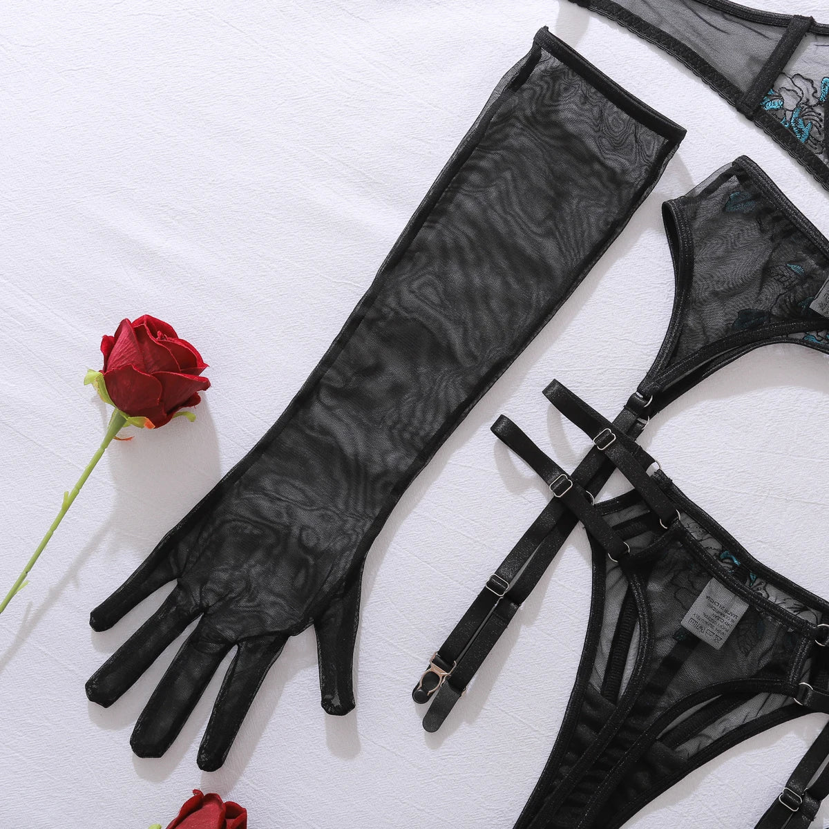Conjunto de lencería de malla con guantes, medias y bordado de encaje azul