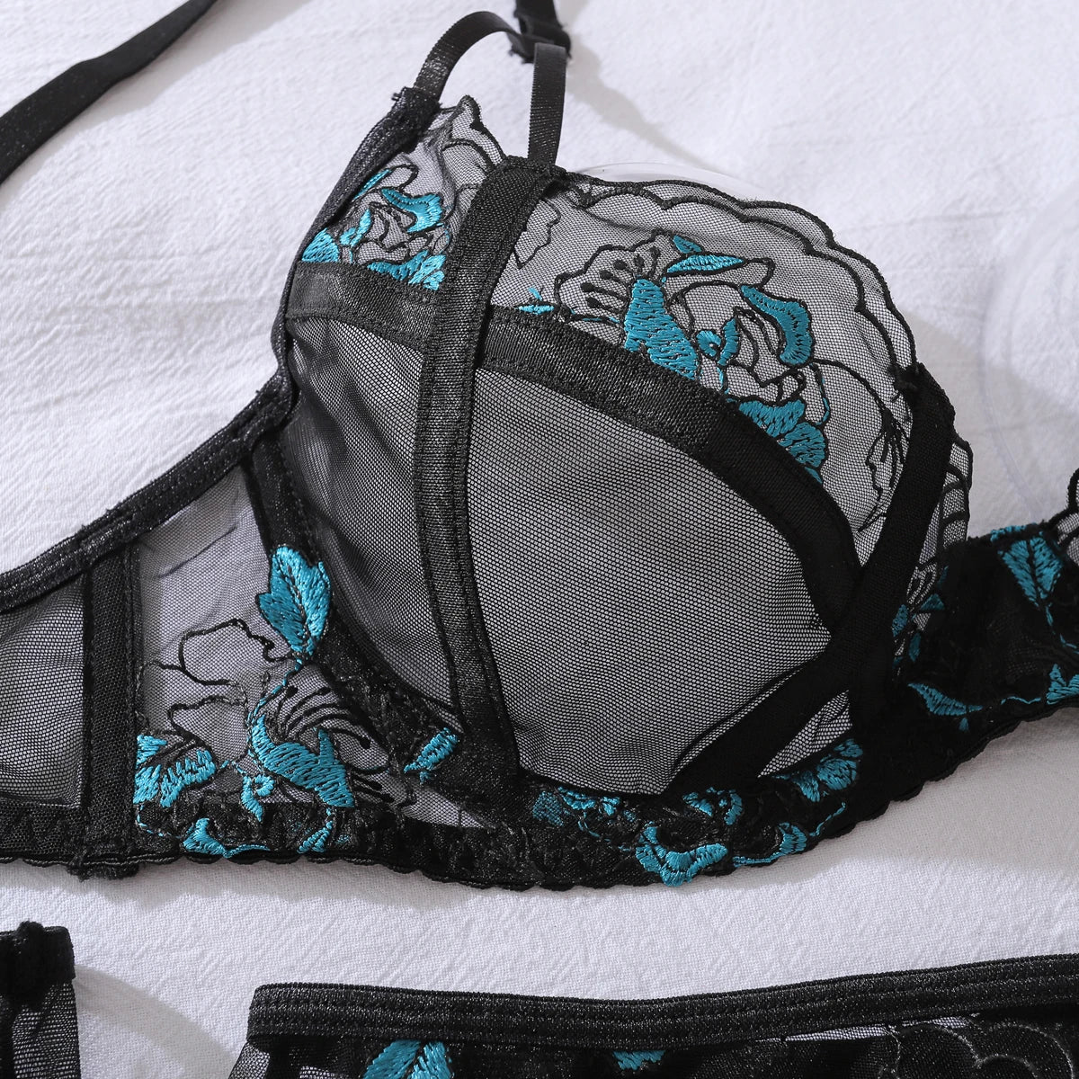 - Conjunto de ropa interior: sujetador, braguita, liguero, guantes y medias - Lencería de malla - Ribete de bordado azul