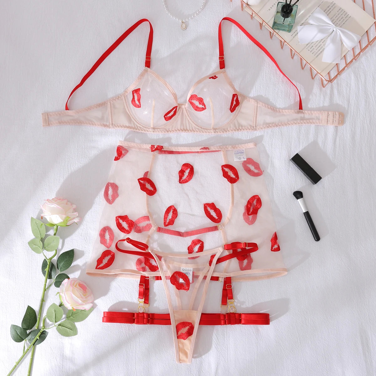 - Conjunto de ropa interior: sujetador, braguita y minifalda - Lencería de malla - Bordado de labios - Estilo semitransparente