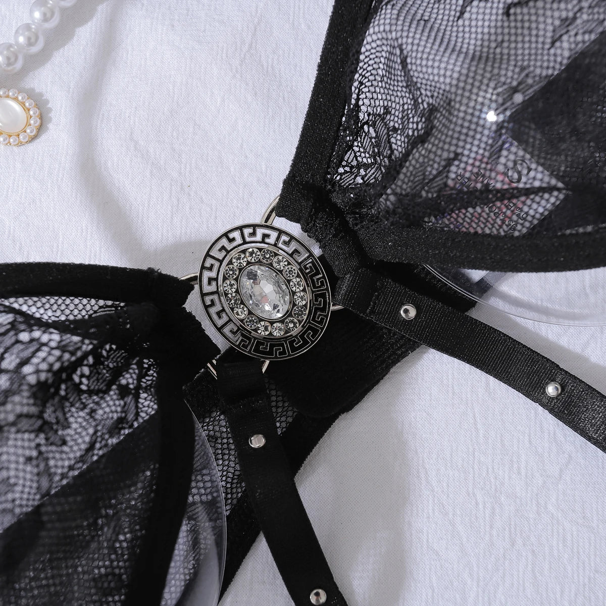- Camisón con braguita y medias - Lencería de encaje - Ribete de elemento brillante - Tiras y recortes