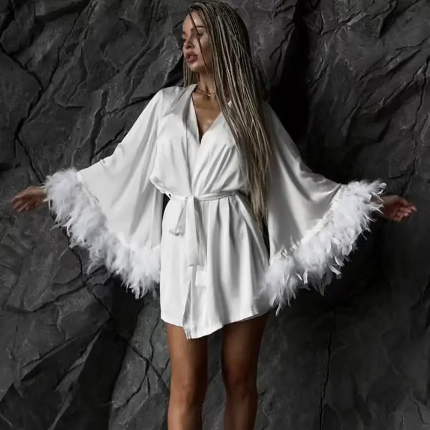 Conjunto de pijama de raso con bata con plumas - Laurene.es